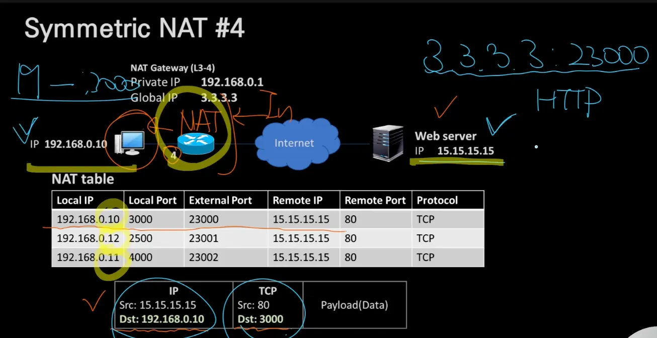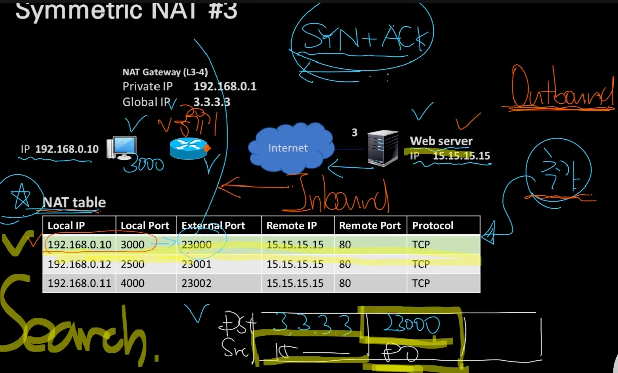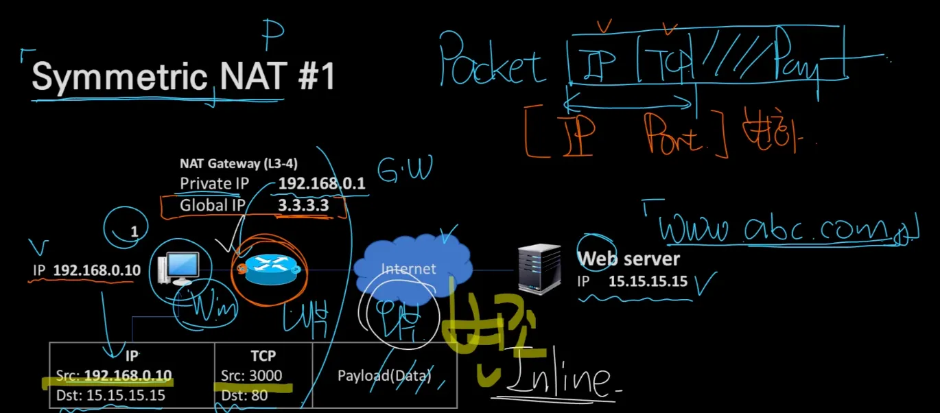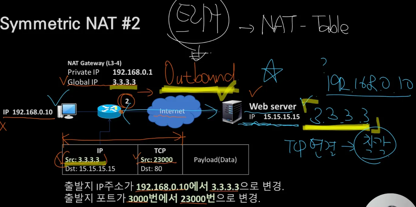 최초 패킷이 생성될 때 출발지는 Private IP와 Port가 매핑이 된다.