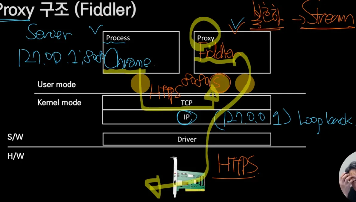 HTTPS 통신을 할 때 루프백(127.0.0.1)을 이용하여 Fiddler를 프록시 서버 삼아서 통신한다.