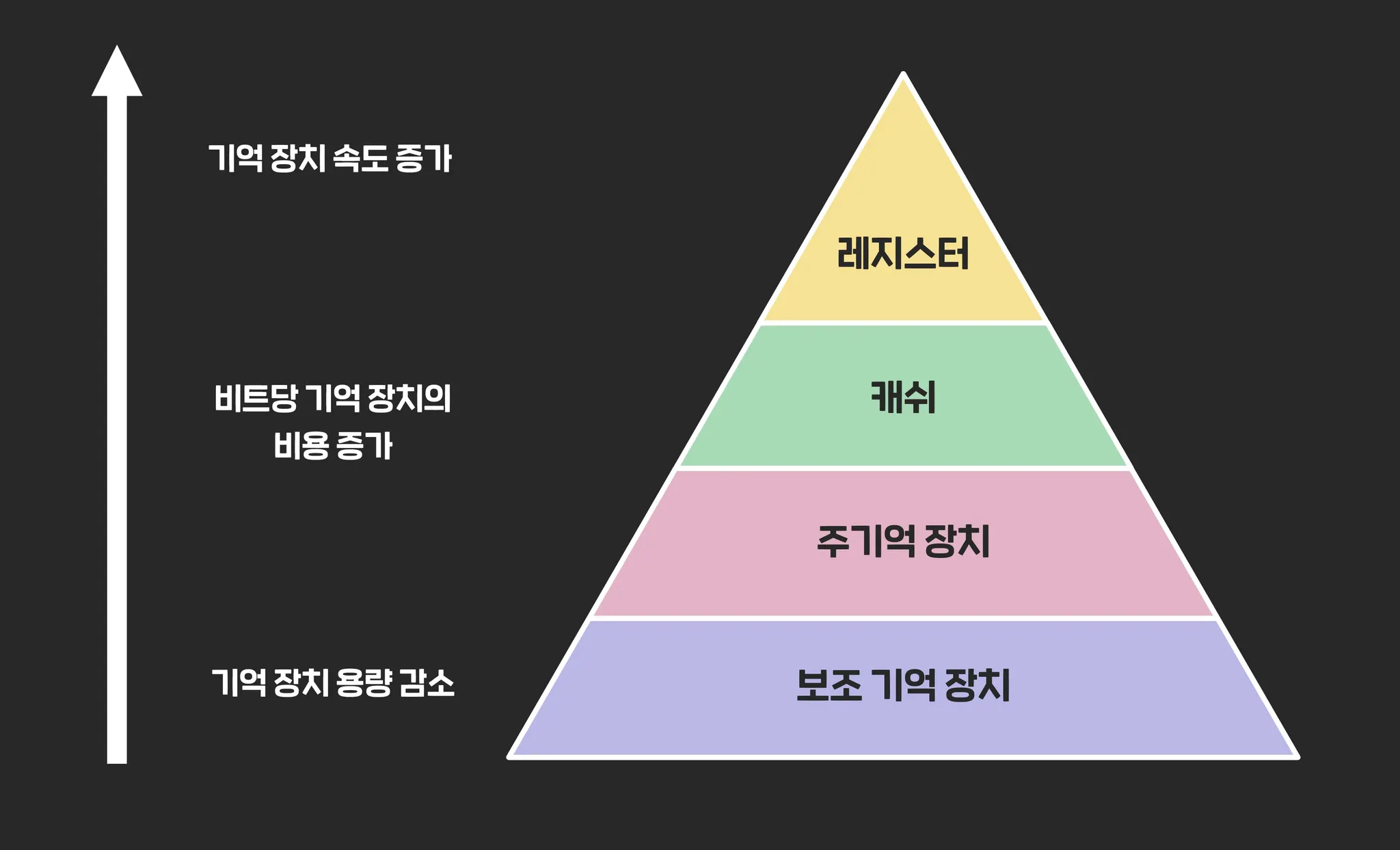 메모리는 CPU에서 빨리 접근할 수 있도록 다음과 같이 계층 구조로 나뉜다.