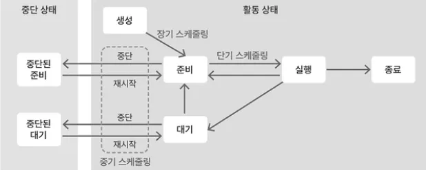 중단 상태는 준비 상태에서 스왑 아웃된 ‘중단된 준비 상태’와 대기 상태에서 스왑 아웃된 ‘중단된 대기 상태’로 구분된다.