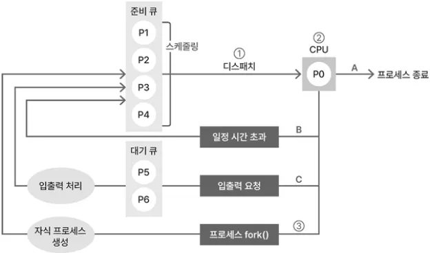 스케줄러가 준비 큐에 있는 프로세스 중 하나를 선택해 CPU에 디스패치 한다.
