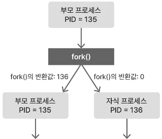 부모 프로세스에서 fork() 함수를 호출하면 부모 프로세스는 자식 프로세스의 PID 값을, 자식 프로세스는 0을 반환한다.