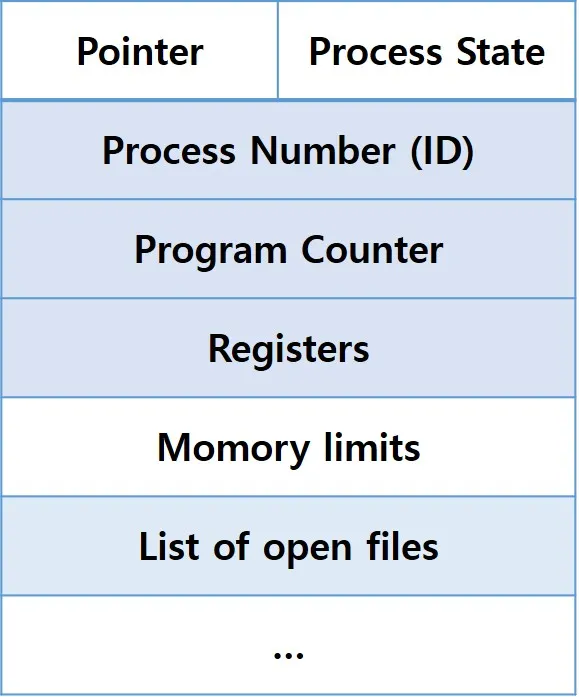 PCB는 프로세스의 현재 상태, 프로세스를 나타내는 고유의 PID(Process ID), 부모 프로세스의 PID, 자식 프로세스의 PID, 다음 실행할 명령어의 주소인 PC(Program Counter), 프로세스의 우선순위, 메모리 제한 등을 저장한다.