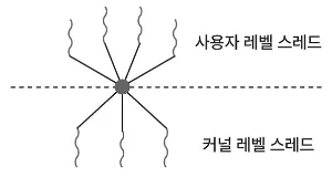 사용자 레벨 스레드 n개에 커널 레벨 스레드 1개가 매핑된다.