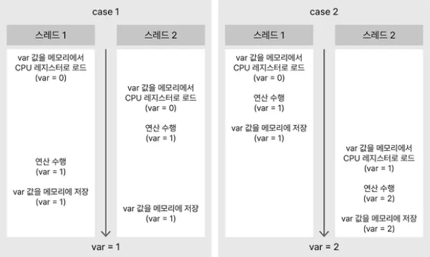 var 변수의 값을 메모리에서 CPU 레지스터로 로드 → 연산 처리 → 연산 결과를 메모리에 작성하는 과정을 거치게 된다.
