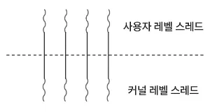 하지만 사용자 레벨 스레드 수만큼 커널 레벨 스레드가 생성되므로 성능 저하가 일어날 수 있다.