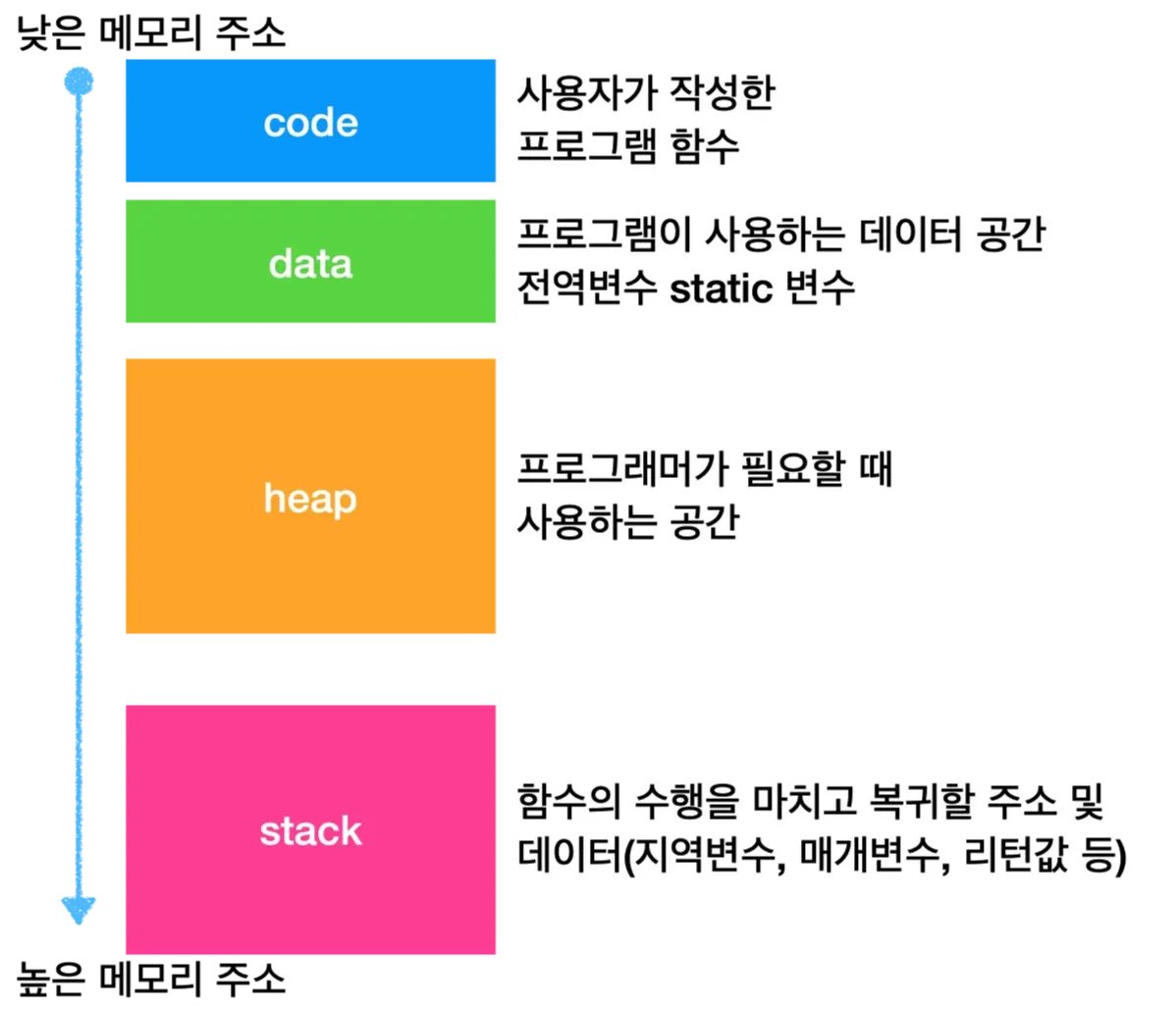 여기서 스택 영역과 힙 영역은 동적으로 메모리 할당이 가능해 두 영역 사이에 빈 메모리 공간이 존재한다.