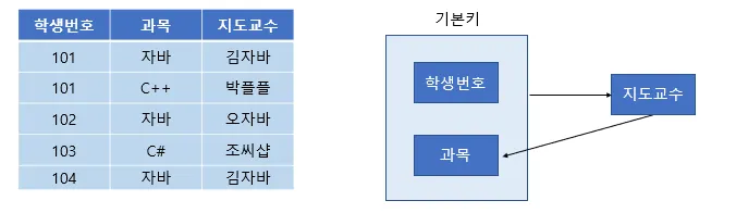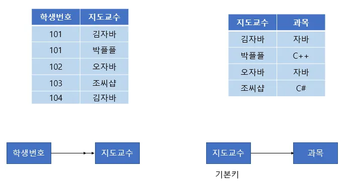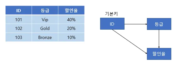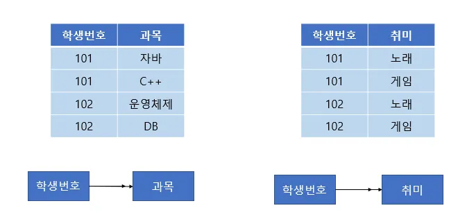 함수 종속성은 테이블에서 속성 간 종속 관계를 의미한다.
