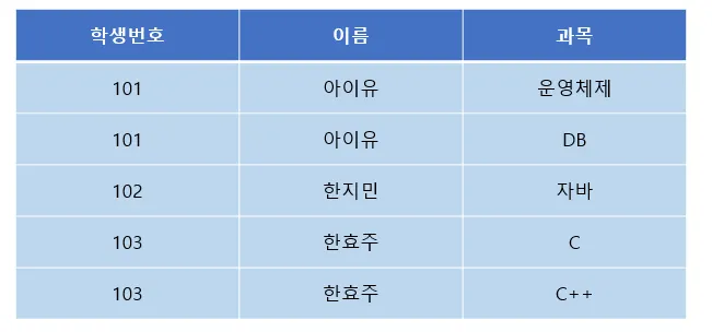 제1정규형(First Normal Form)은 테이블의 모든 속성 값이 더 이상 분해될 수 없는 값, 즉 원자 값으로 구성되어야 한다.