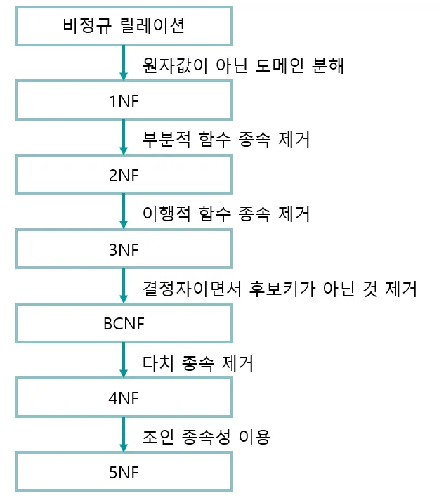 정규화한 결과를 정규형(normal form)이라고 하며 테이블을 분해하는 정도에 따라서 단계를 다음과 같이 나눌 수 있다.