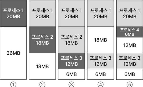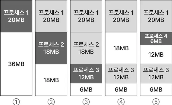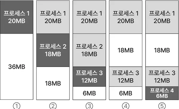 그리고 프로세스 3과 프로세스 4처럼 분할된 크기보다 작은 프로세스가 할당되어 메모리 공간이 남는 경우를 내부 단편화(internal fragmentation)라고 한다.