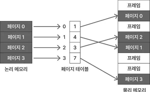 페이징(paging) 기법은 프로세스의 논리 메모리 영역과 물리 메모리 영역을 각각 일정한 크기의 페이지(page)와 프레임(frame)으로 나누며 이때 페이지와 프레임 크기는 동일하다.