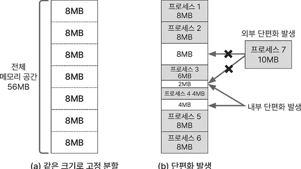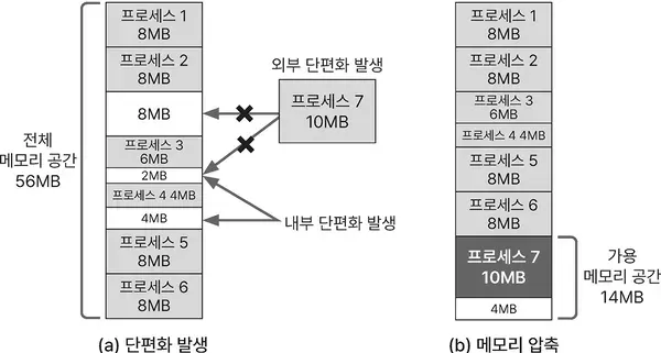 8MB의 메모리 공간과 2MB의 메모리 공간을 합치면 프로세스 7에 공간을 할당할 수 있지만 고정 분할 때문에 할당하지 못하며 이런 경우를 외부 단편화(external fragmentation)라고 한다.