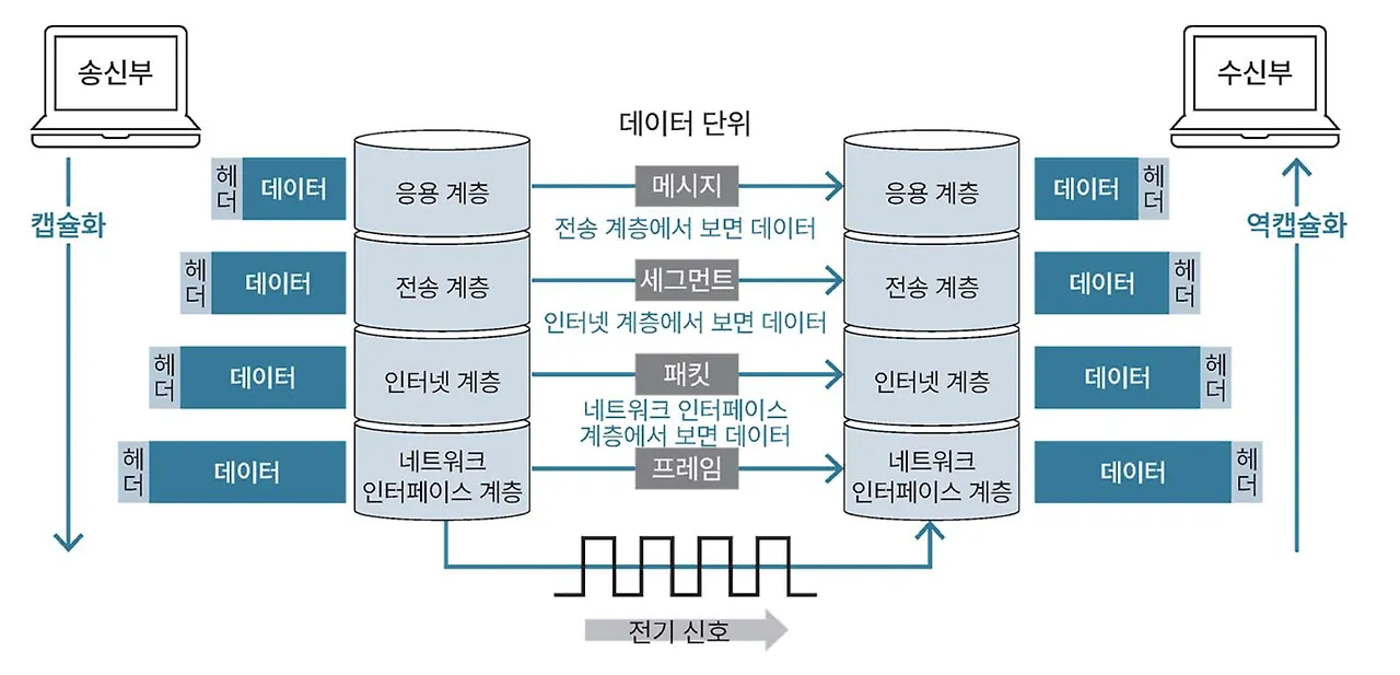 송신부에서 데이터 캡슐화를 거친 결과물을 수신부로 보낸다.
