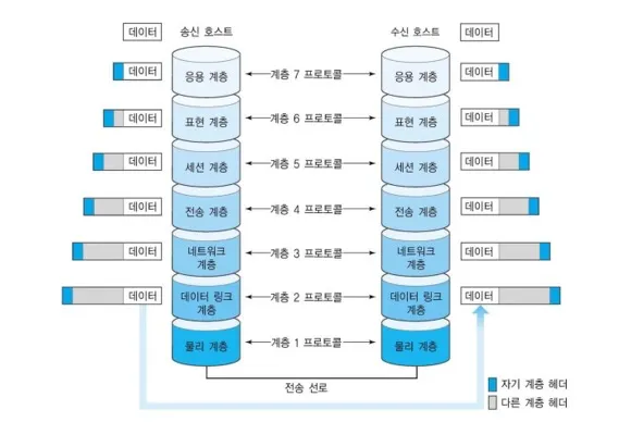 데이터를 송신할 때는 높은 계층에서 낮은 계층으로 전달하고, 데이터가 수신부의 가장 낮은 계층에 도달하면 수신부에서는 낮은 계층에서 높은 계층으로 데이터를 전달한다.