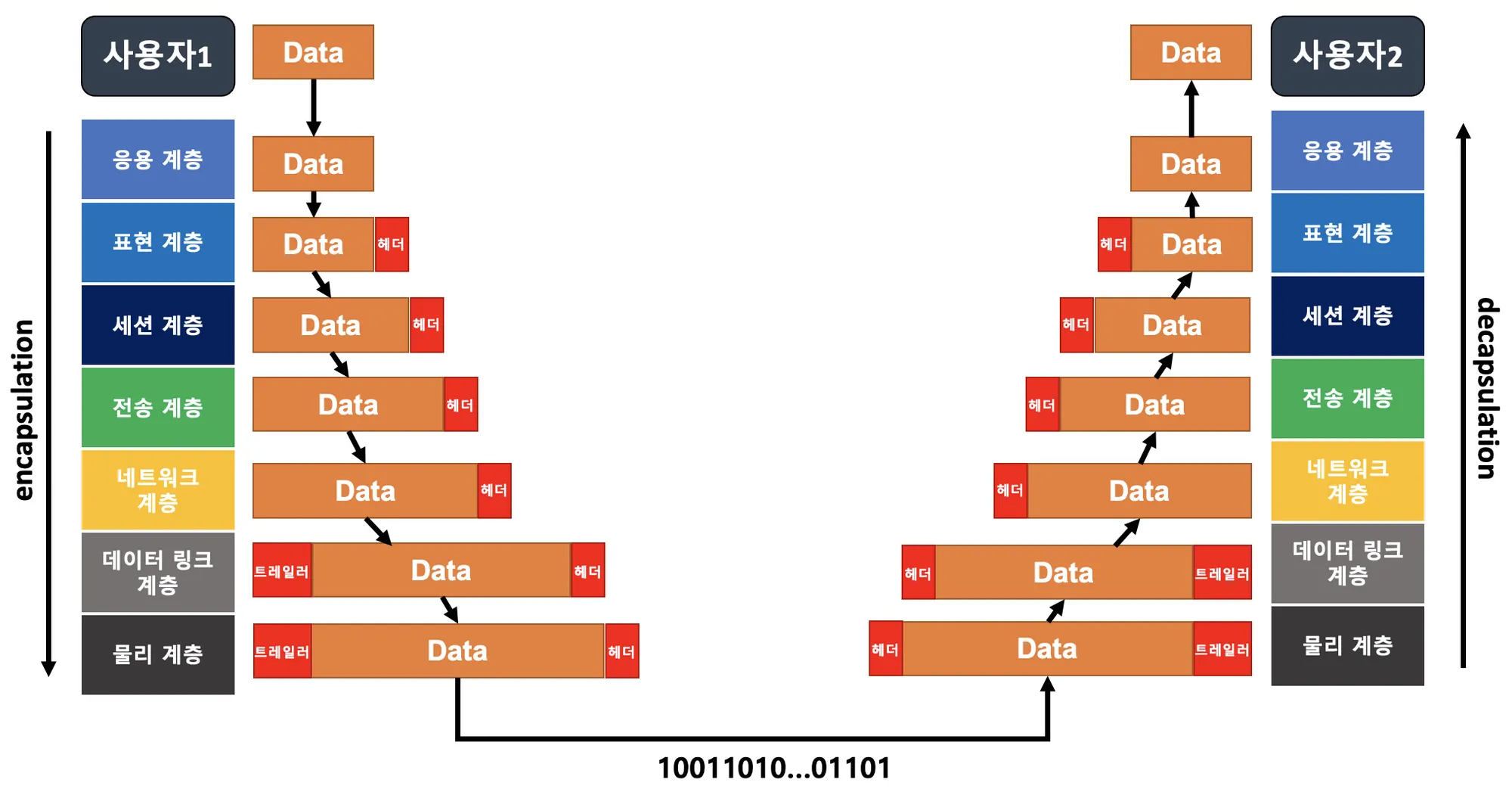 이때 제어 정보를 담은 헤더(header)나 트레일러(trailer)가 붙는데 이 과정을 데이터 캡슐화(data capsulation)라고 한다.