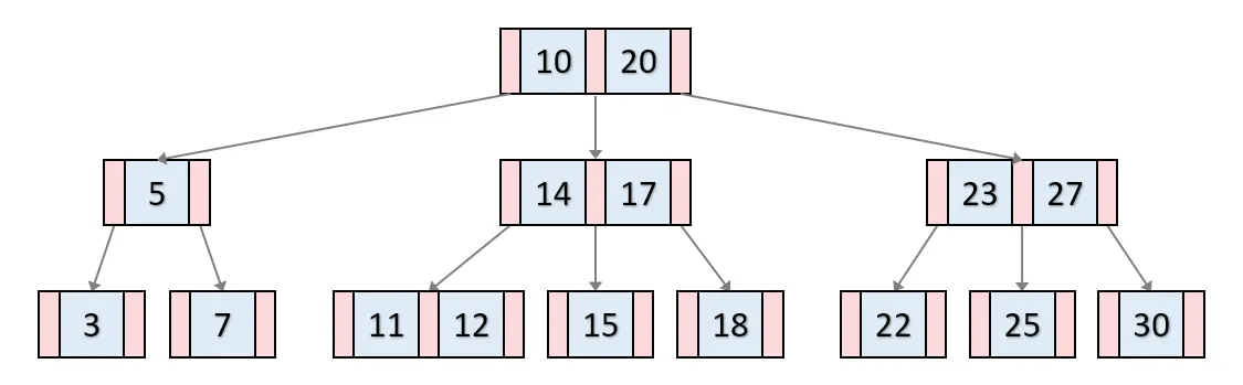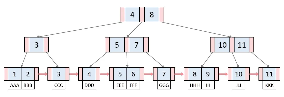 B+ 트리는 단말 노드에만 데이터를 저장하고 단말 노드 간에는 연결 리스트로 연결되는 방식이다.