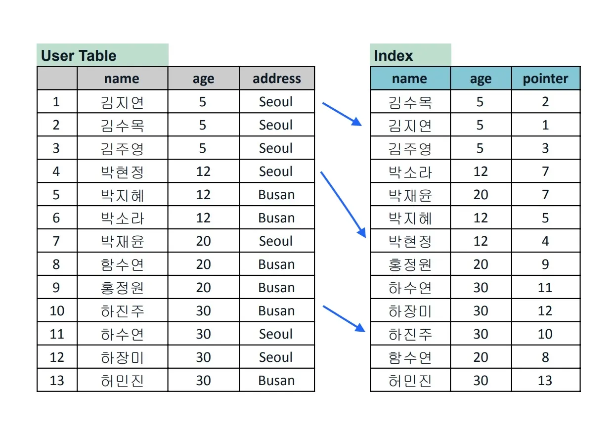 키-값 형태로 속성 값-튜플 주소를 인덱스 테이블에 저장한다.