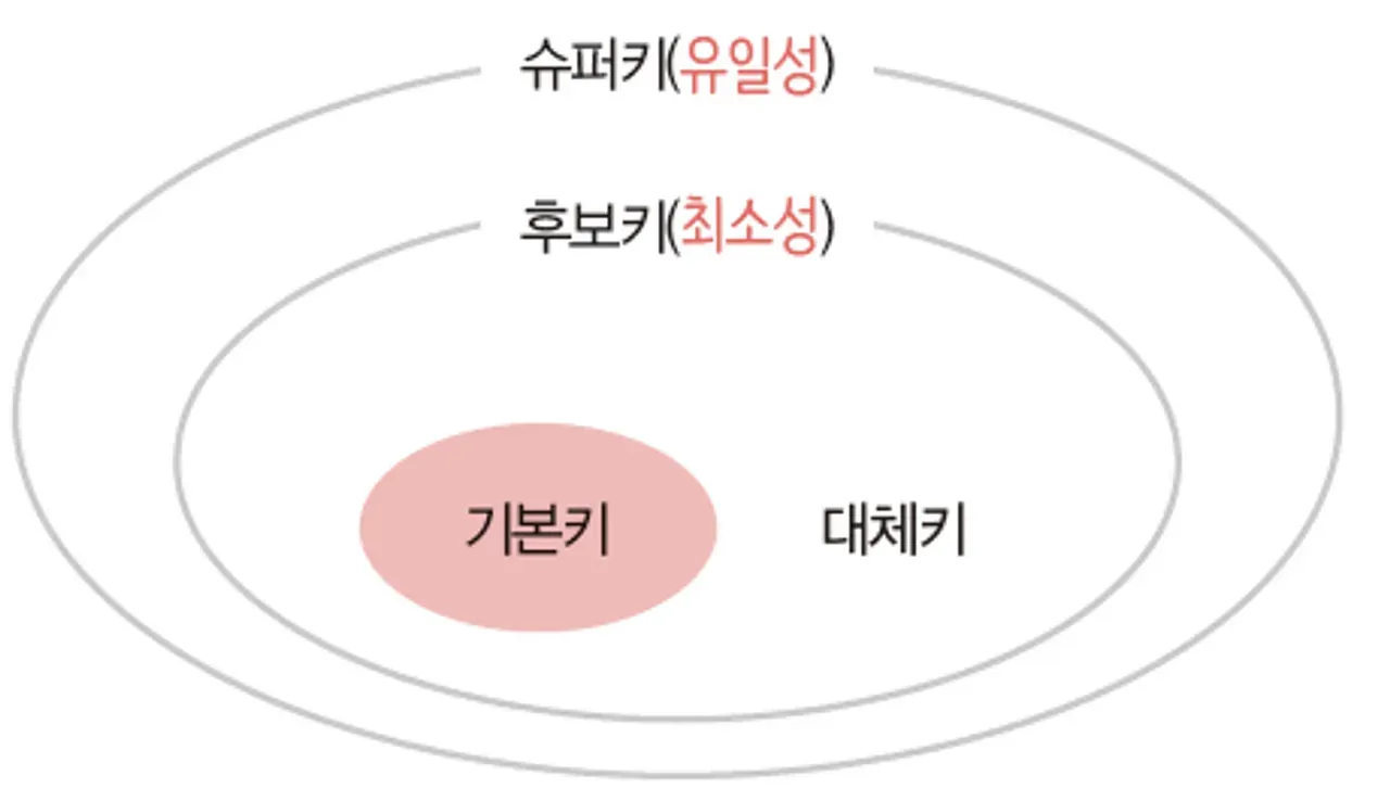 슈퍼 키 중 최소성을 만족하면 후보 키, 후보 키 중 메인이 되는 키를 기본 키, 그 외 키를 대체 키라고 한다.
