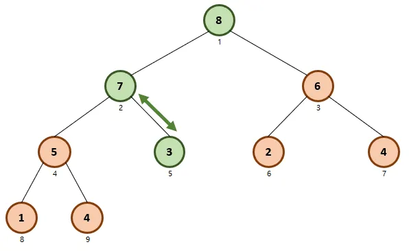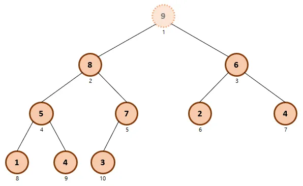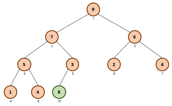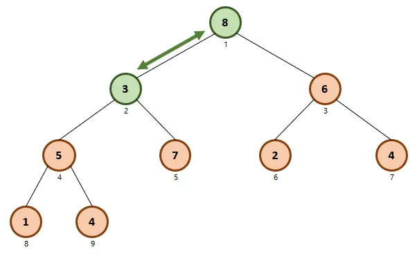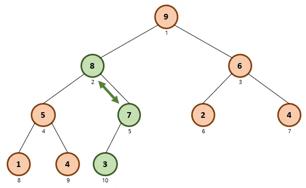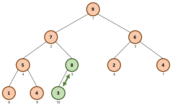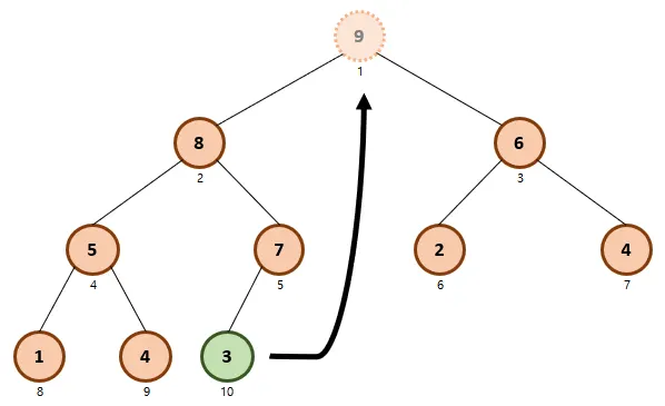 삭제한 후에는 루트 노드 자리에 힙의 마지막 노드(마지막 레벨의 가장 오른쪽 노드)를 옮긴 후 힙을 재정렬한다.