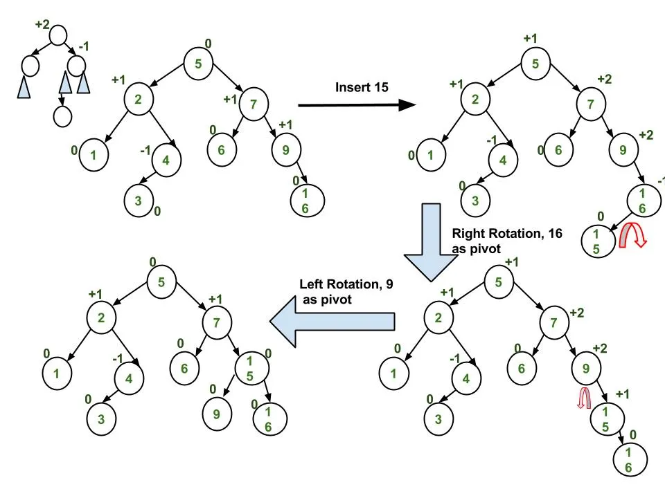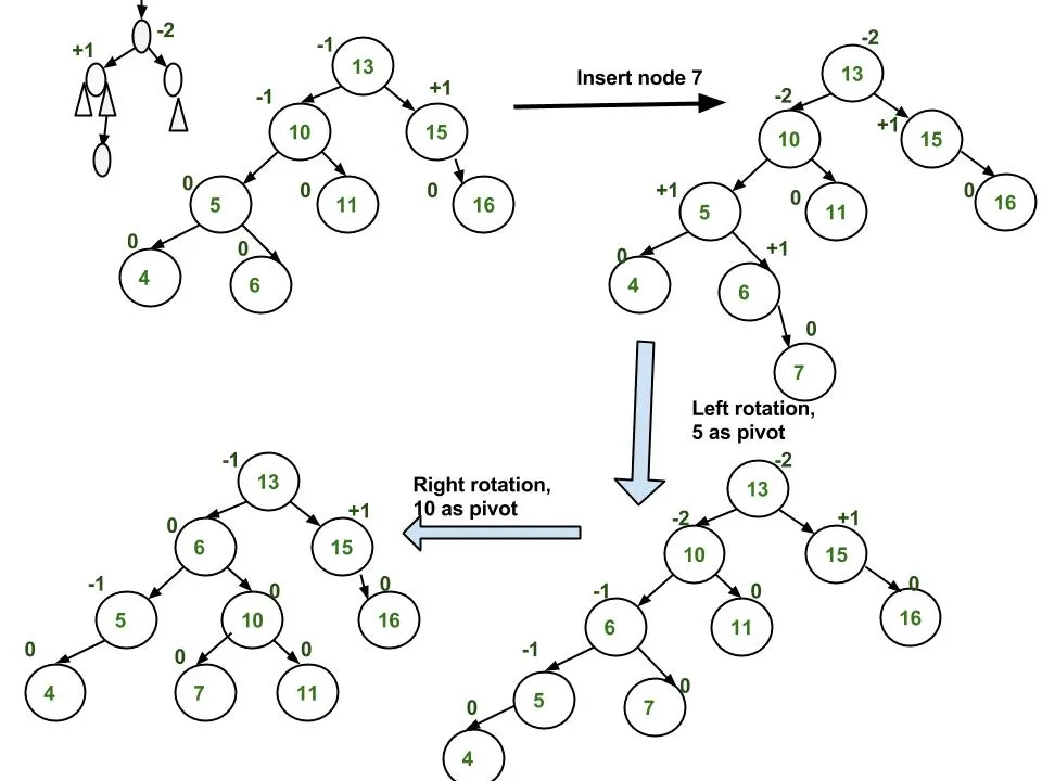 오른쪽, 왼쪽으로 불균형을 이룰 경우 마지막 레벨에 위치한 노드를 중심으로 오른쪽으로 회전한 후 왼쪽으로 회전해서 균형을 맞춘다.