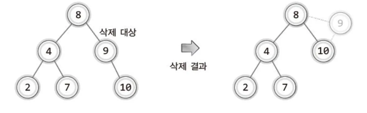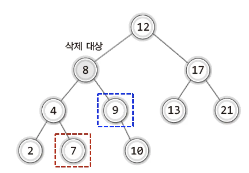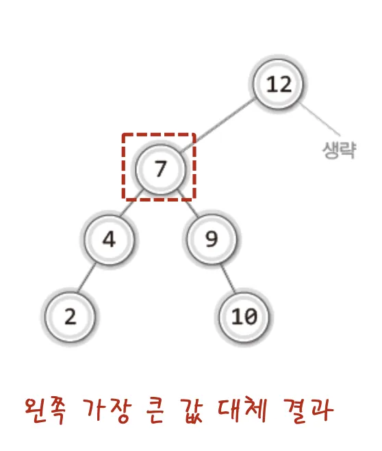 또는 왼쪽 서브 트리에서 가장 큰 값을 삭제한 노드 위치로 옮겨도 된다.