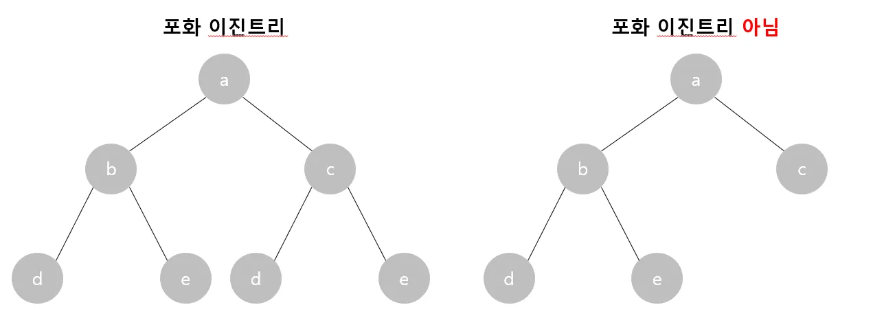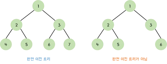 트리의 마지막 레벨을 제외한 모든 레벨에 노드가 채워져 있으며 마지막 레벨은 왼쪽에서부터 오른쪽으로 노드가 채워져 있는 이진 트리다.