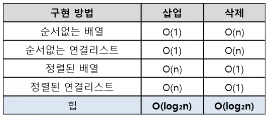 우선순위 큐를 구현하는 방식은 배열, 연결 리스트, 완전 이진 트리인 힙이 있다.