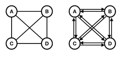 두 정점이 연결되어 있을 때 순서가 없으므로 (A, B)와 (B, A)는 동일한 간선을 의미한다.