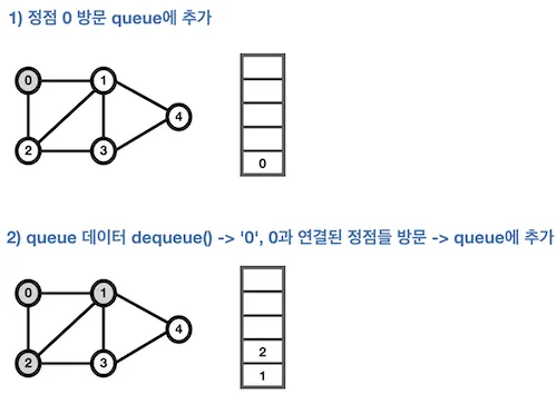 먼저 발견한 정점과 인접한 정점들을 탐색하면서 큐에 삽입한다.