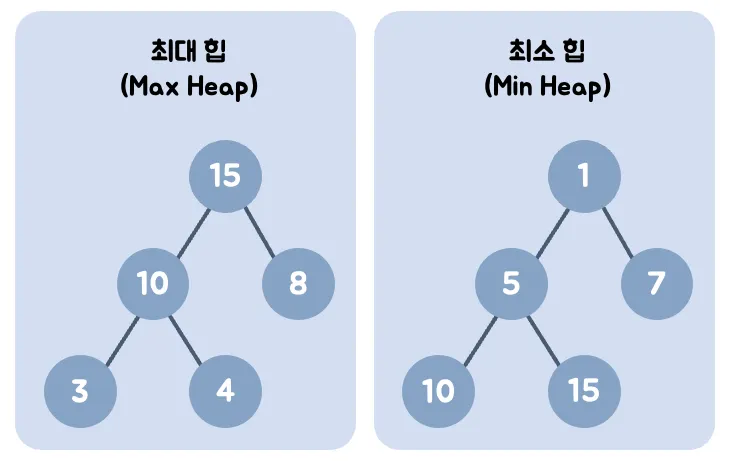 최소 힙(min heap) : 부모 노드의 값이 자식 노드의 값보다 작거나 같은 완전 이진 트리다.