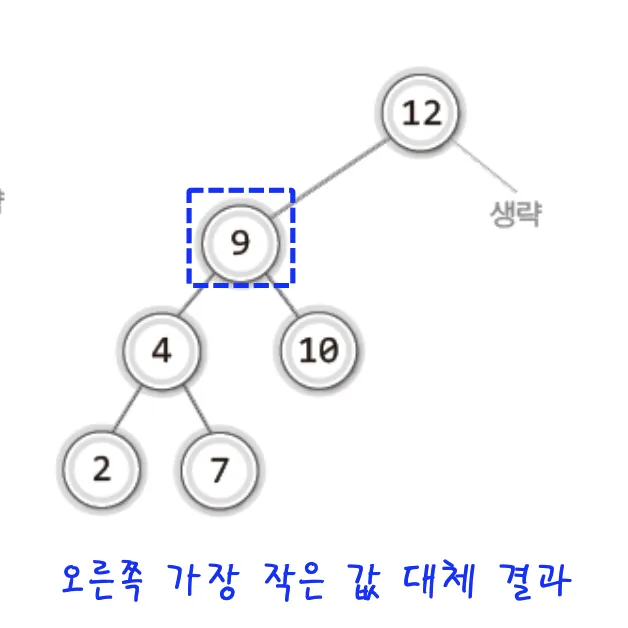 오른쪽 서브 트리에서 가장 작은 값을 삭제한 노드 위치로 옮기면 된다.
