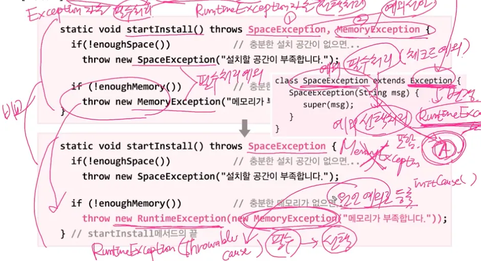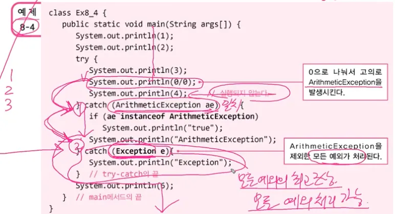 상황에 맞게 호출된 메서드에서 try-catch문으로 처리할지 아니면 호출한 메서드로 떠넘겨서 try-catch문으로 처리할지 선택해야 한다!!!