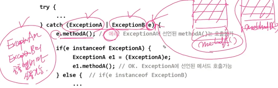 ExceptionA와 ExceptionB 중 참조변수에 어떤 예외가 들어갈지 모르기 때문에 형변환을 해서 사용한다
