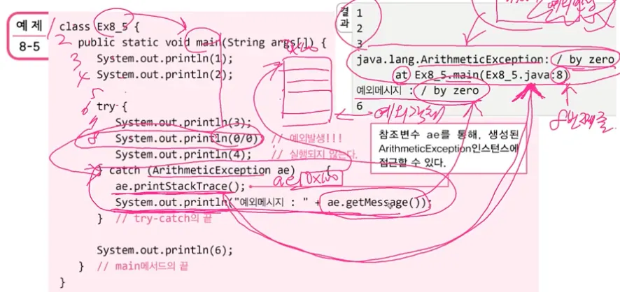 getMessage() : 발생한 예외 클래스의 인스턴스에 저장된 메시지를 얻을 수 있다