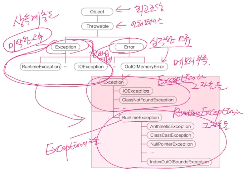 Exception 클래스와 그 자손들이 있다