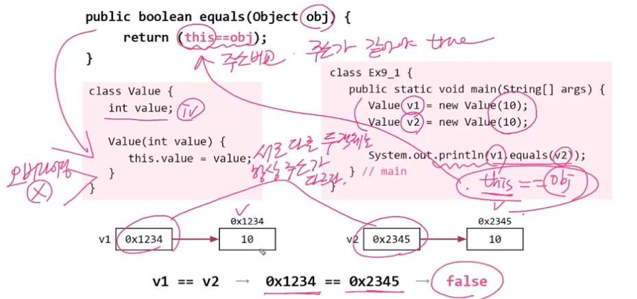 Object 클래스의 equals()는 객체의 주소를 비교 (참조변수 값 비교)