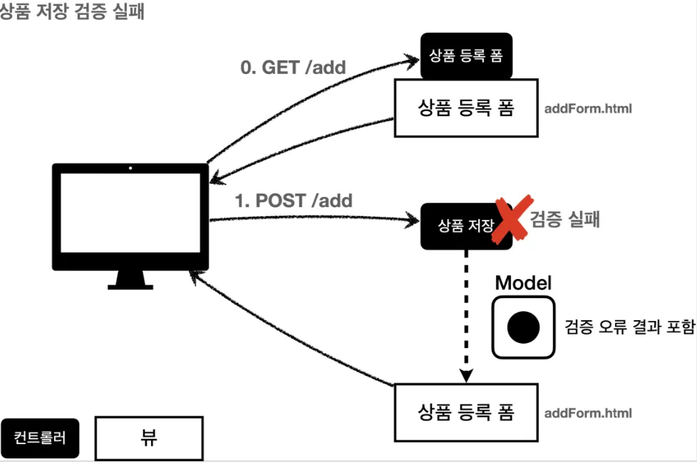 고객이 상품 등록 폼에서 상품명을 입력하지 않거나 가격, 수량 등이 너무 적거나 커서 검증 범위를 넘어서면 서버 검증 로직이 실패해야 한다. 이렇게 검증에 실패한 경우 고객에게 다시 상품 등록 폼을 보여주고 어떤 값을 잘못 입력했는지 친절하게 알려주어야 한다.