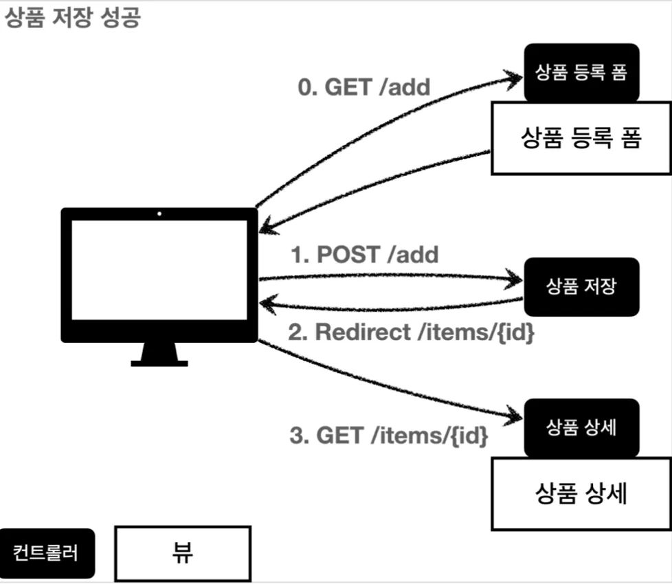사용자가 상품 등록 폼에서 정상 범위의 데이터를 입력하면 서버에서는 검증 로직이 통과하고 상품을 저장하고 상품 상세화면으로 Redirect한다.