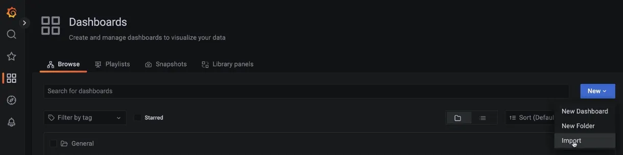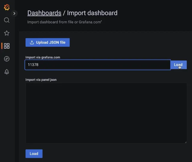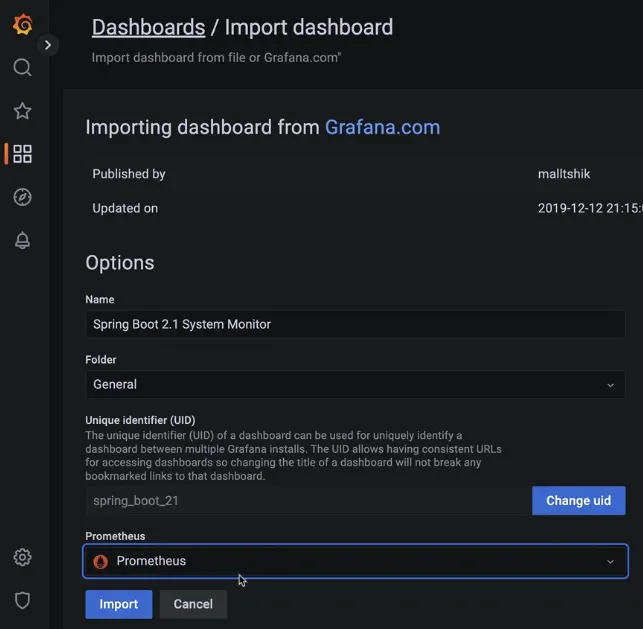 new → import → 공유 대시보드의 ID를 입력 → Load → Datasource 선택 → import