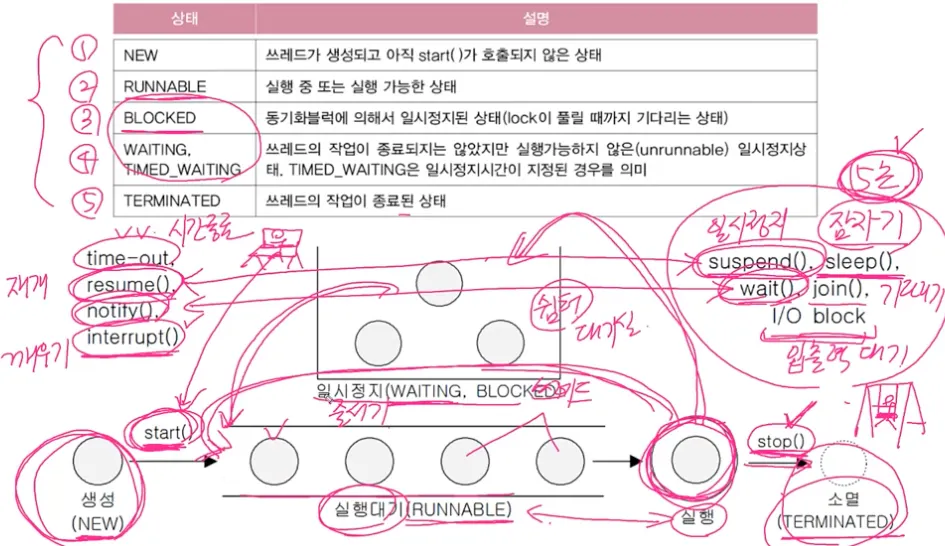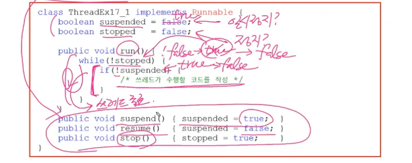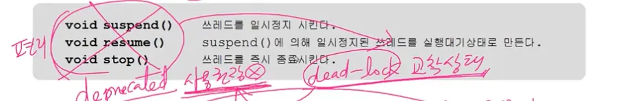 스레드의 실행을 일시정지(suspend), 재개(resume), 완전정지(stop) 시킨다