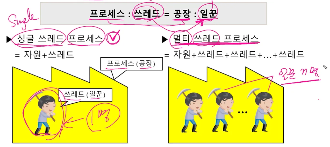 스레드 : 프로세스 내에서 실제 작업을 수행. 모든 프로세스는 최소한 하나의 스레드를 갖고 있다