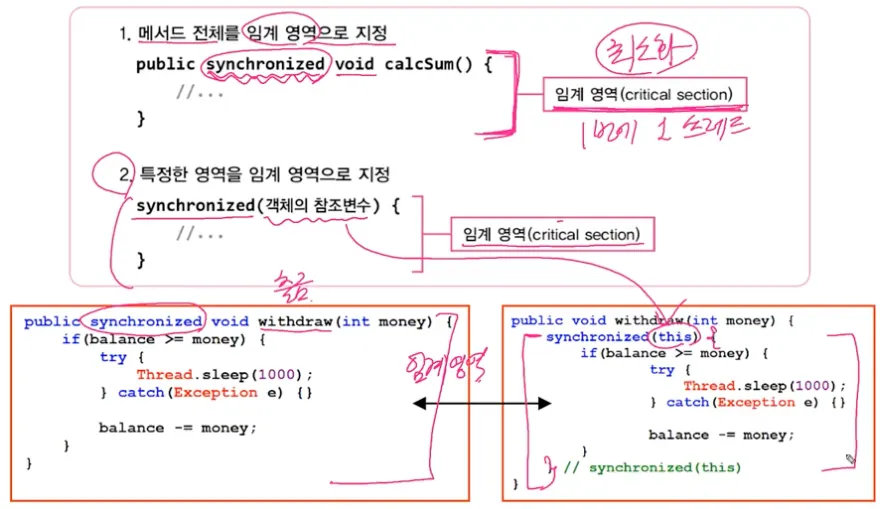 synchronized로 임계영역(lock이 걸리는 영역)을 설정하는 방법 2가지
