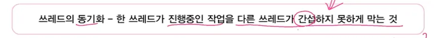 진행중인 작업이 다른 스레드에게 간섭받지 않게 하려면 ‘동기화'가 필요