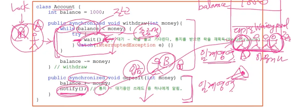 그 단점을 보완하기 위해 (=동기화의 효율을 높이기 위해) wait(), notify() 사용