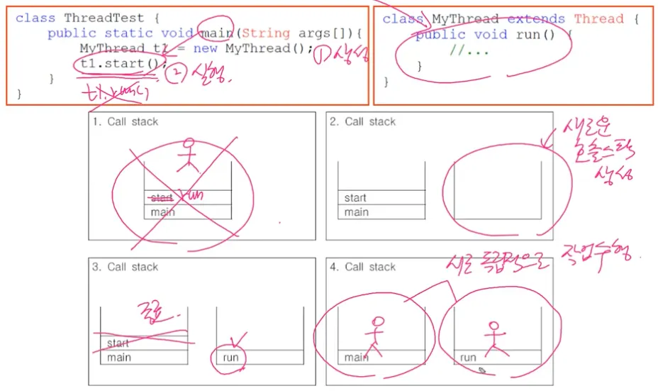→ start()를 통해 새로운 스택을 만들어 run()을 호출하고 start()는 종료된다