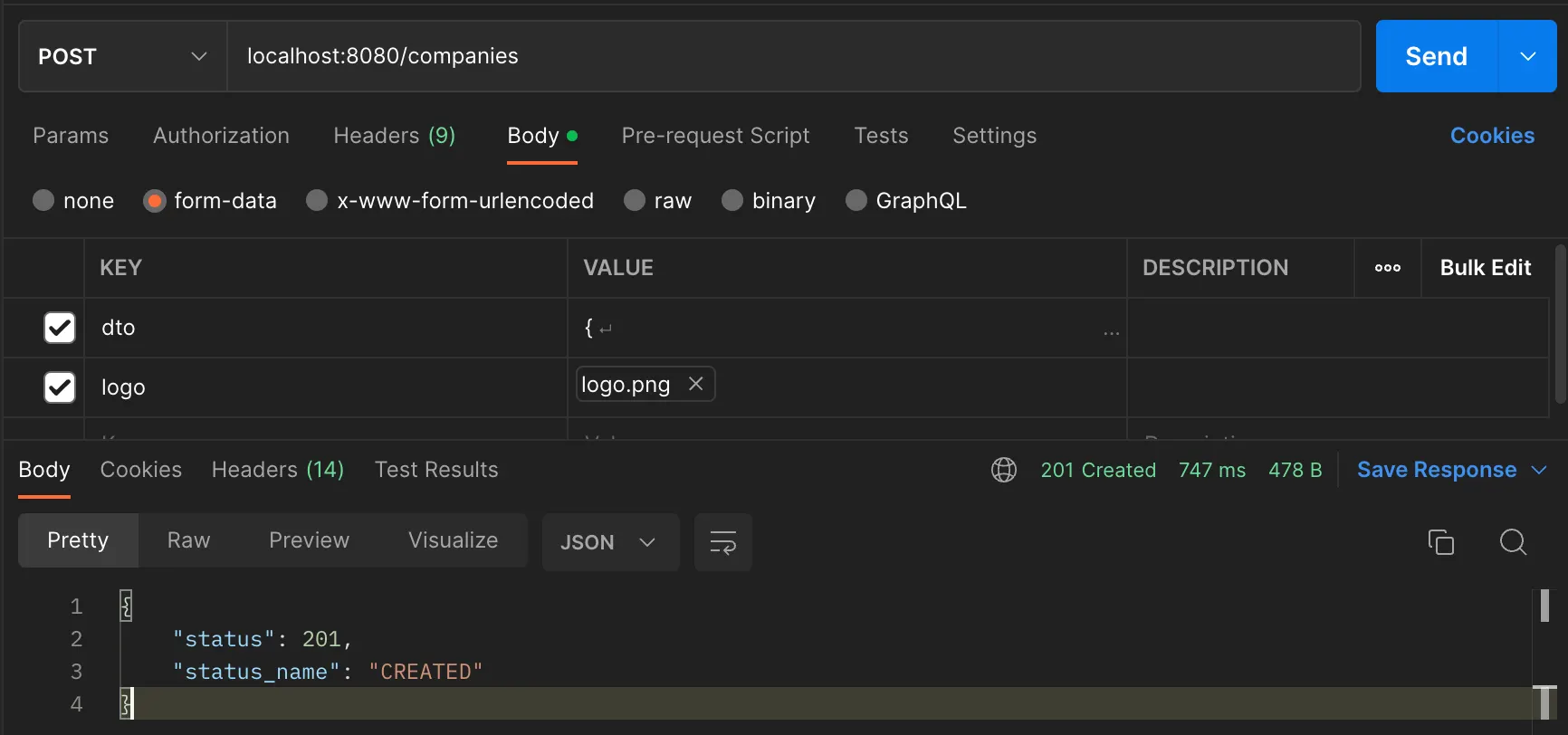 먼저 포스트맨으로 기업 등록 API 를 통해 로고 업로드를 시도해보았습니다.