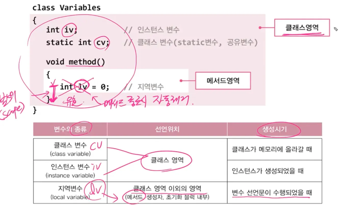 class 영역에서 static이 없는건 인스턴스 변수고 인스턴스가 생성되면 쓸 수 있다