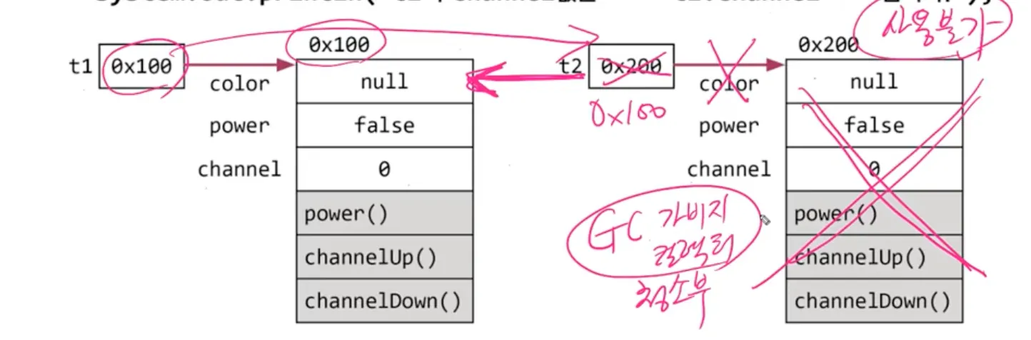 하나의 인스턴스를 여러 개의 참조변수가 가리키는 경우(가능)