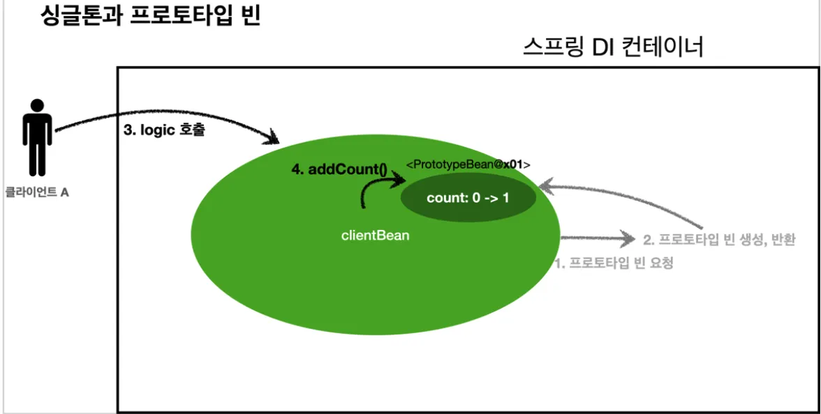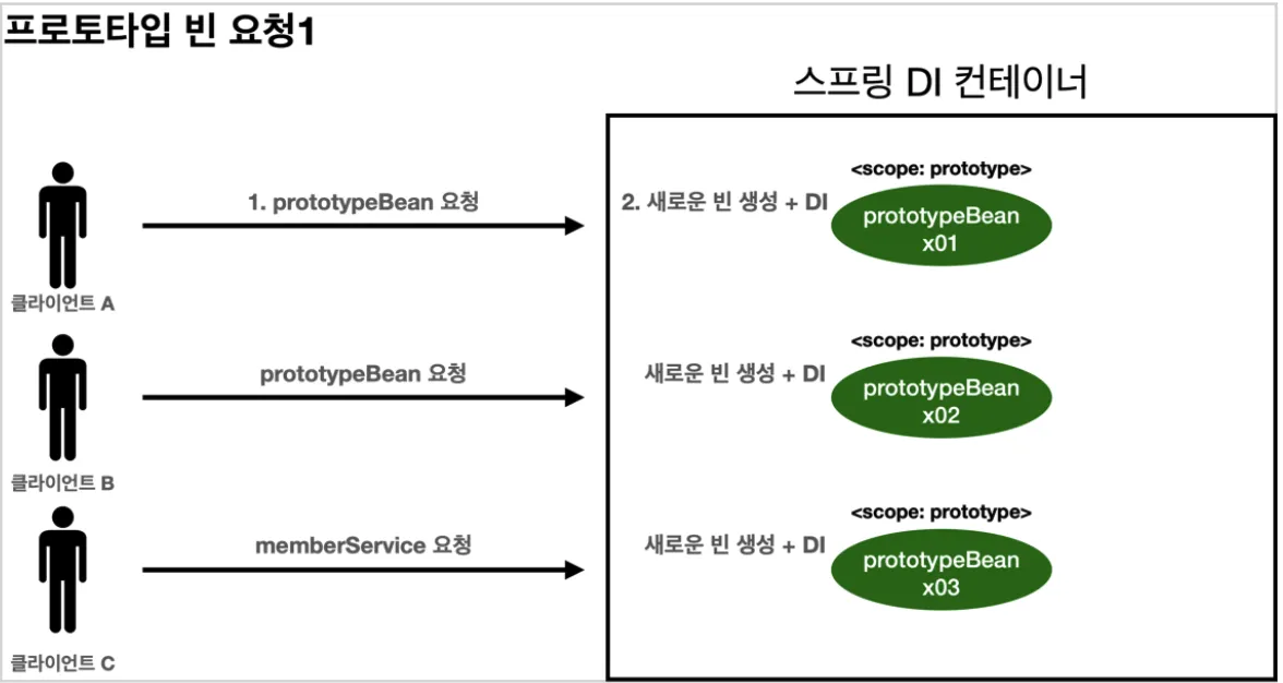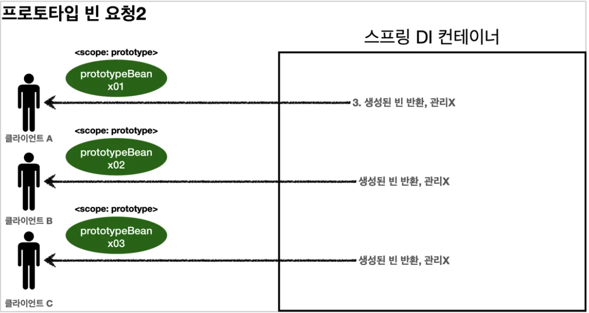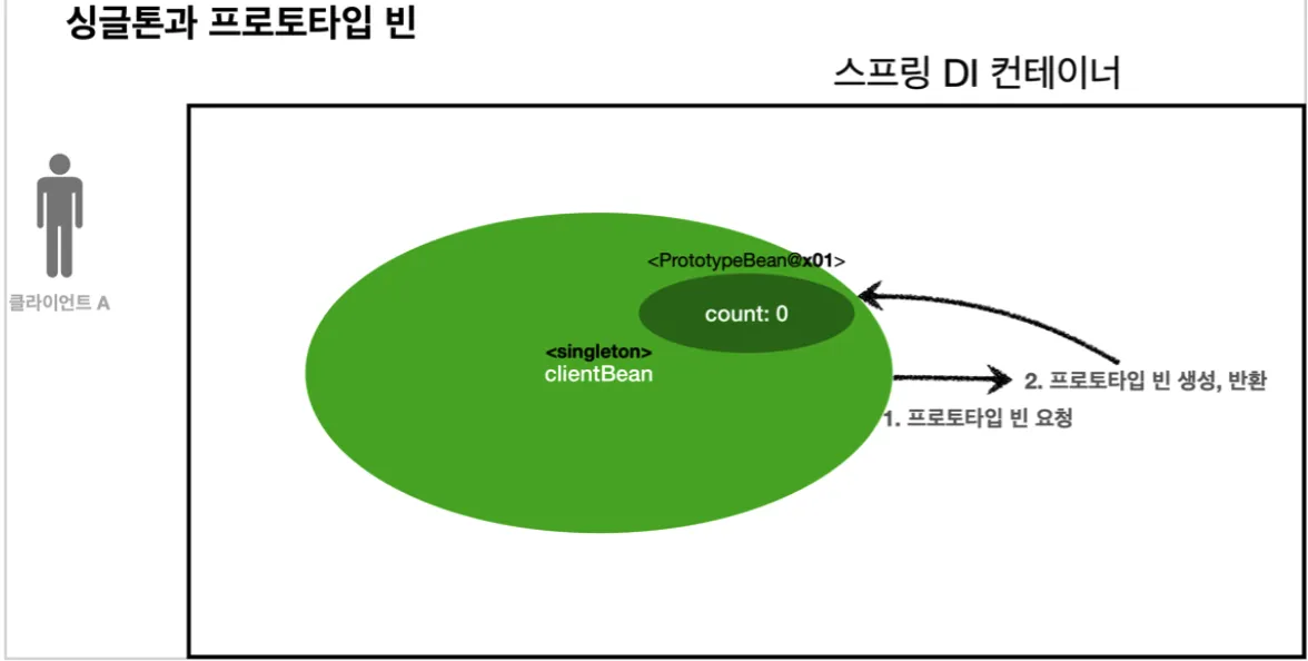 clientBean1과 clientBean2에서 각각 프로토타입 빈을 주입 받아서 새로운 인스턴스의 프로토타입 빈을 생성할 수도 있다.